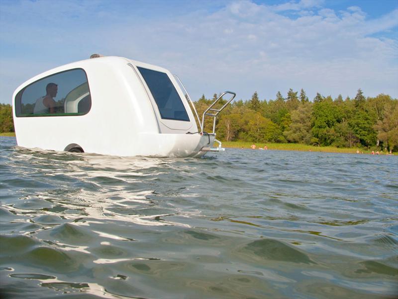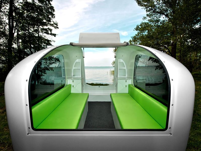 Bajo un diseño minimalista, y con sus 3.89 metros de largo, con 1.60 metros de ancho y 1.85 de alto, el remolque acuático funciona como “lancha” para pescar o bien para pasar un romántica noche bajo la luna y sobre algún lago. Sin embargo si se prefiere “posarse” a la orilla de algún rio o adentrarse en el bosque el remolque ofrece distintos modos de uso como son: salón, comedor o habitación.