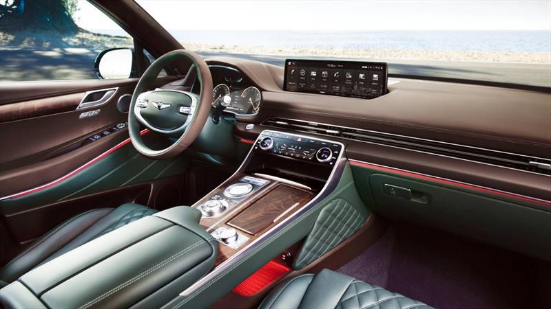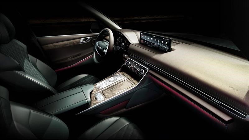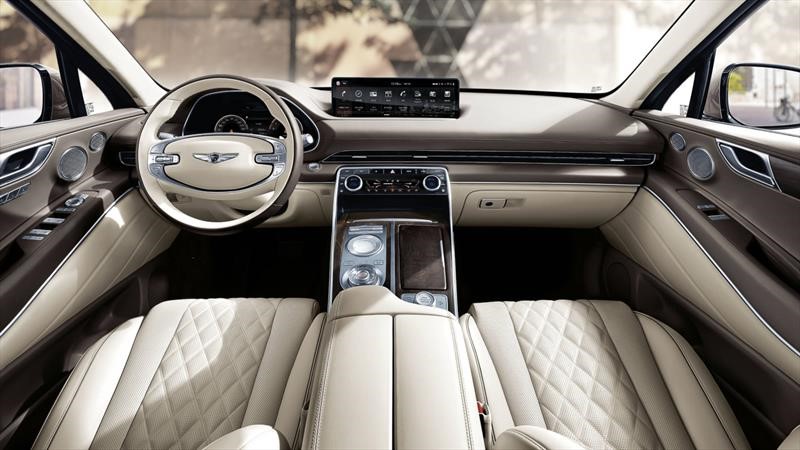 Lo más impresionante está en el interior, construido, según Genesis, aplicando la filosofía de arquitectura coreana llamada "la belleza del espacio blanco". Los materiales y texturas vistas en el habitáculo no las conocíamos de ningún modelo del Grupo Hyundai, con líneas horizontales sobre el tablero que resaltan la amplitud del interior y una consola central ultra ancha que deja espacio para los mandos, posavasos y mucho más.