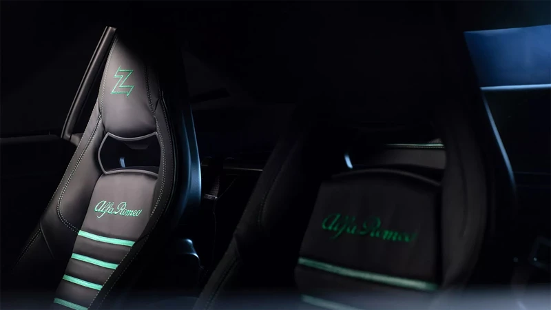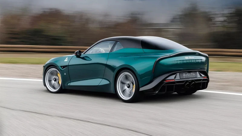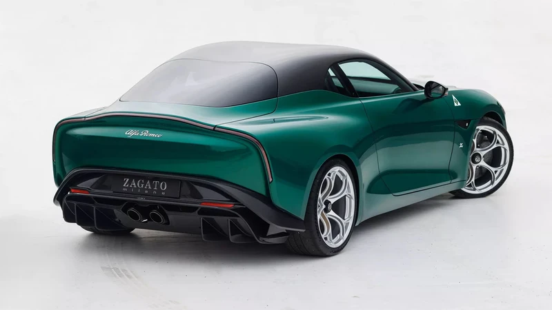 Luego, para su diseño, Zagato tomó prestada algunas cuestiones estéticas de otros modelos de la marca, algo que puede verse en el frente en las ópticas LED propias del Tonale. Mirando al coupé desde un costado, podemos ver que su perfil se caracteriza por un capó largo, una parte trasera corta y un panel de techo de doble burbuja de fibra de carbono sin pintar. Atrás remata una una barra de luces delgada y curva y un difusor de aire de gran tamaño.