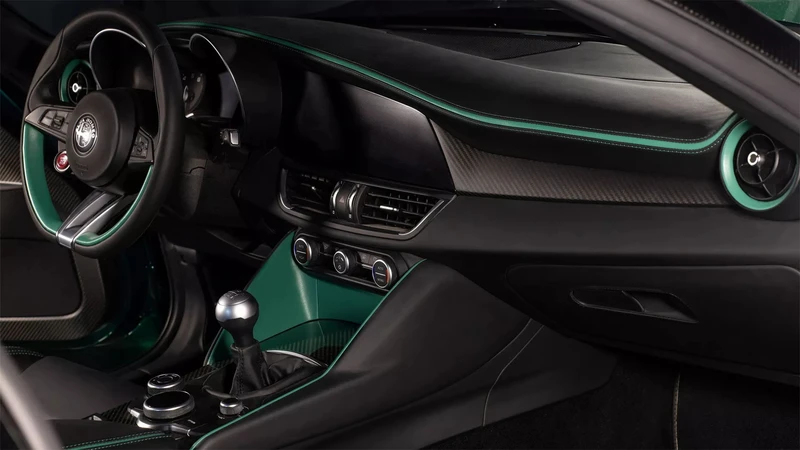 En su interior podemos ver que la cabina es prácticamente la misma que la del Giulia, ya que tenemos mismo volante, pantalla táctil, salidas de aire e interfaz de control de clima en las mismas ubicaciones, pero en este caso se hacen presente acentos en color verde y varias piezas de acabado de fibra de carbono específicas del modelo.