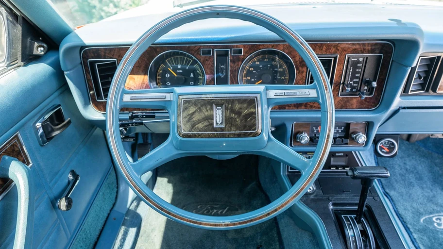 El ejemplar en subasta luce una carrocería restaurada en bitono azul y blanco, con defensas y molduras cromadas recientemente pulidas. En el interior, conserva los asientos de vinilo azul con detalles en tela escocesa, aire acondicionado, control de crucero, radio AM/FM de botones Motorola y ventanas manuales. Además, incluye una llanta de refacción de tamaño completo montada detrás de los asientos.